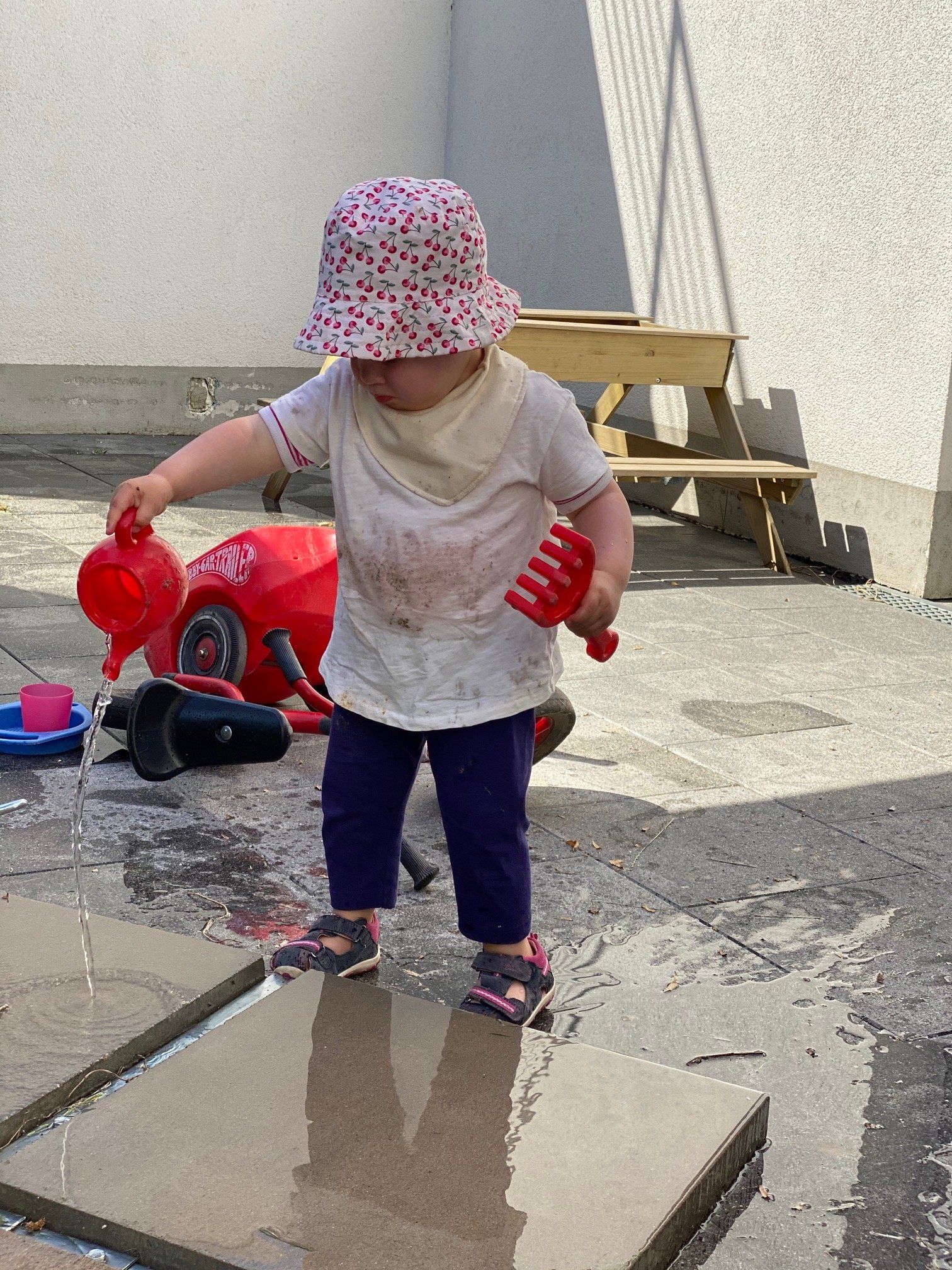 Buttonmit Wasser spielen und erfahren ob Nass auch wirklich Nass ist. Trockene Wechselkleidung haben Mama und Papa schon in der Krippe hinterlegt.